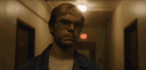 A man with curly hair and glasses standing in a dimly lit hallway with neutral expression.