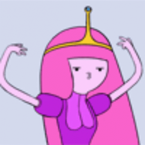 Cartoon character resembling Princess Bubblegum from Adventure Time, wearing a crown and a purple dress, with arms raised.