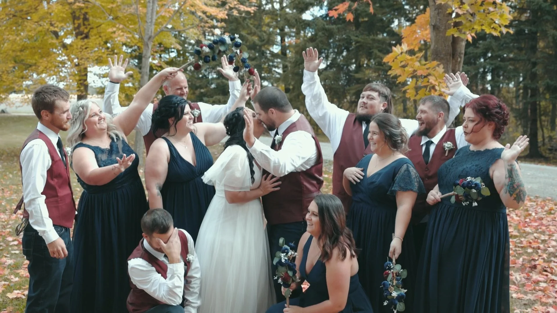 A wedding celebration outdoors with the bride and groom kissing surrounded by friends and family, some holding flowers, with autumn trees and fallen leaves in the background.